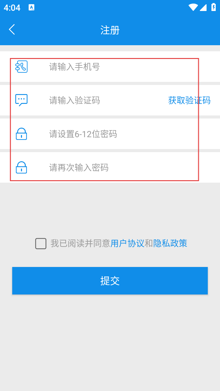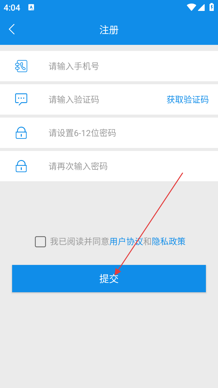 3、依次填【手机号】【验证码】【密码】,勾选协议准备提交。
