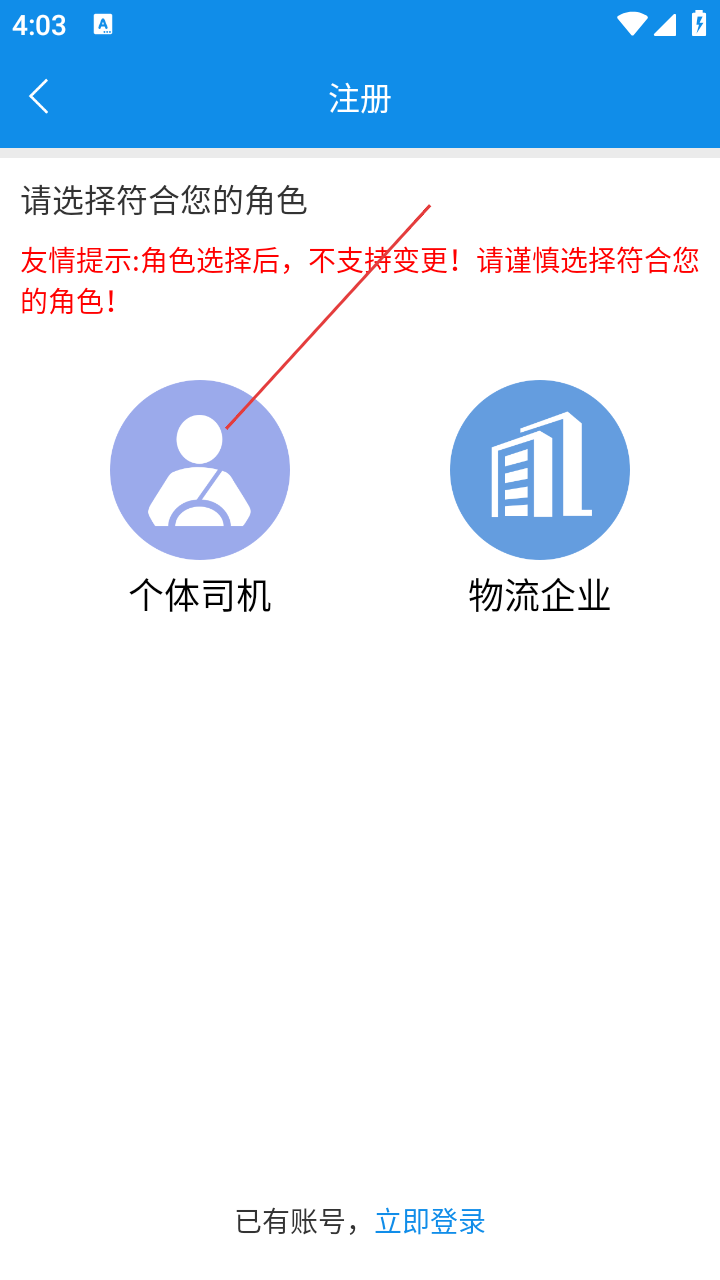 2、注册页选角色,如【个体司机】,进入信息填写环节。