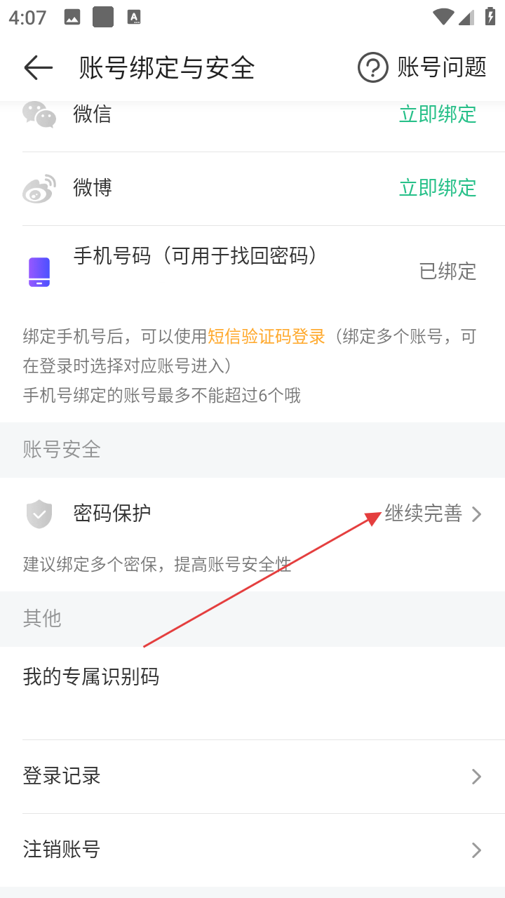4、在账号绑定与安全设置页面,可点击【密码保护-继续完善】,绑定多个密保,提升账号安全性。