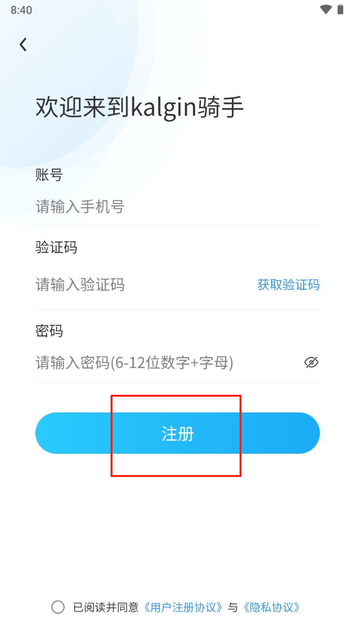 3、注册新账户:输入手机号、验证码和密码,点击“注册”按钮创建新账户。