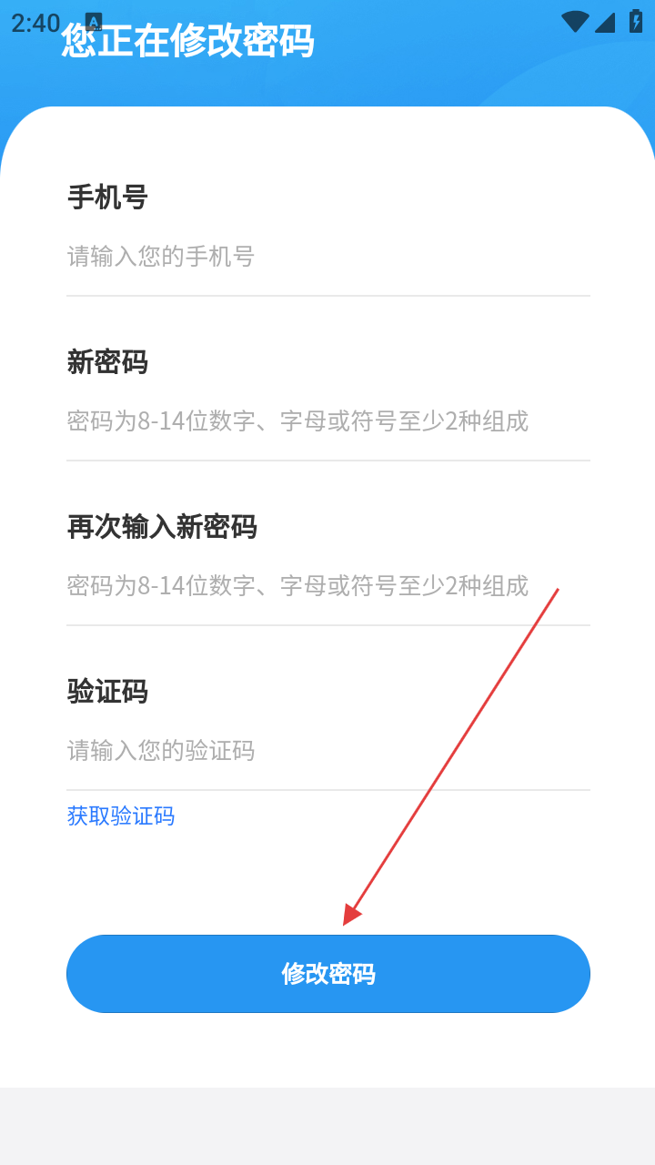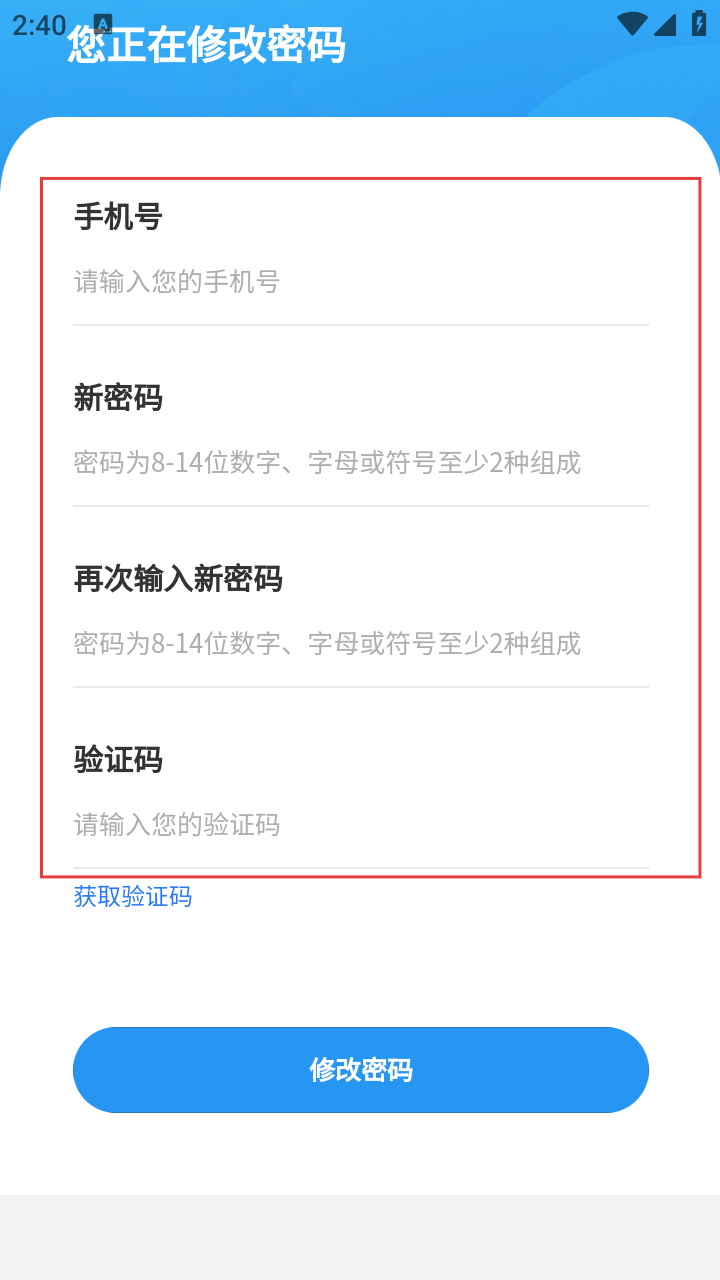 2、在密码修改页填手机号、新密码、再次输入新密码、获取并填验证码。