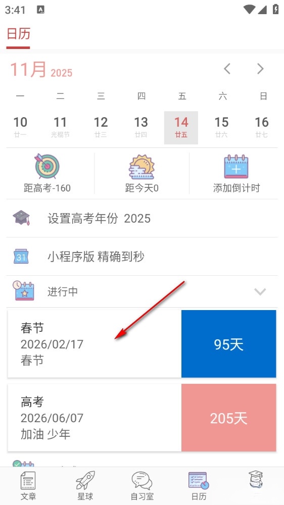 3、日历页面:可以添加多个事件,一模,二模等等,每个考试日还有多少时间都一目了然;