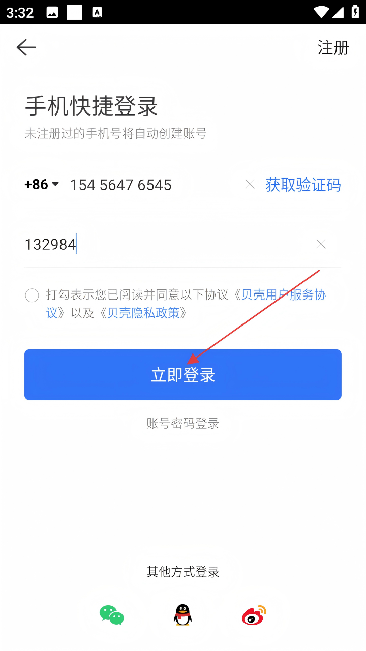 4、将收到的验证码输入后,勾选已阅读并同意相关协议,最后点击【立即登录】,即可完成登录操作。