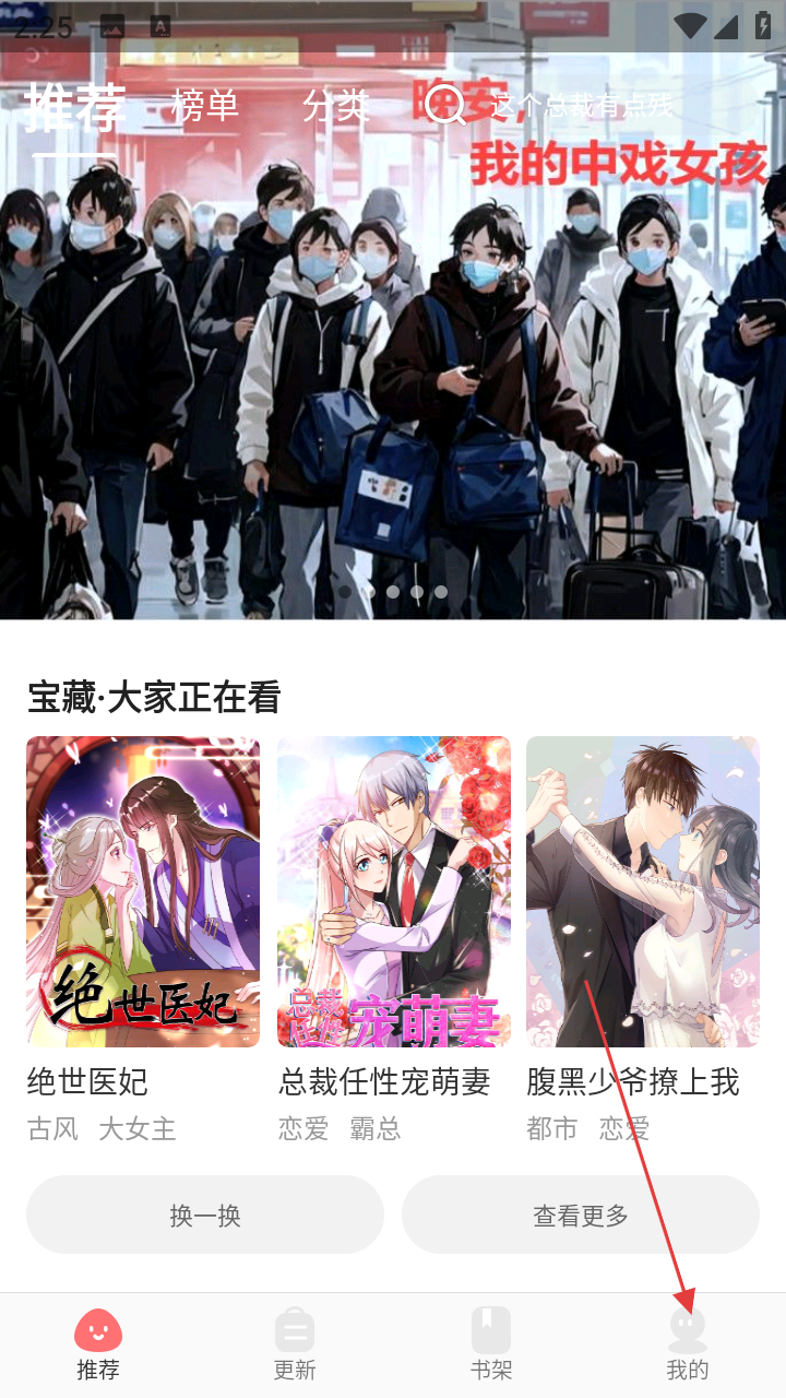 1、在好看漫画首页,可浏览推荐漫画,通过【榜单】【分类】找内容,点击【我的】进入个人页面。
