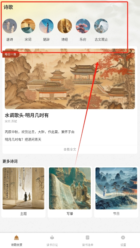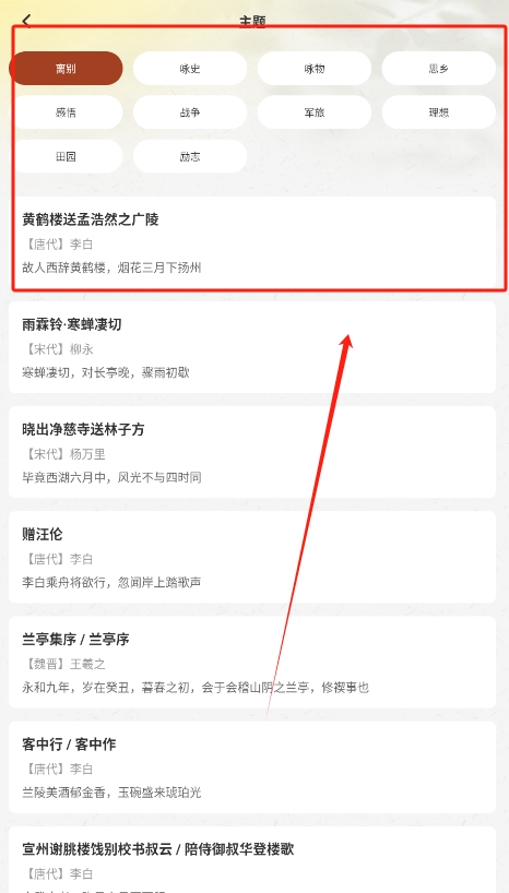 2、接着,可以浏览不同主题和类型的古诗词,选择感兴趣的诗词进行鉴赏,可深入了解作品背景及创作分析。