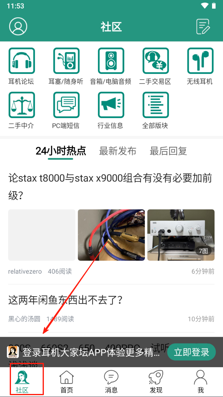 1、点击“社区”进入社区页面,浏览24小时热点和最新发布。