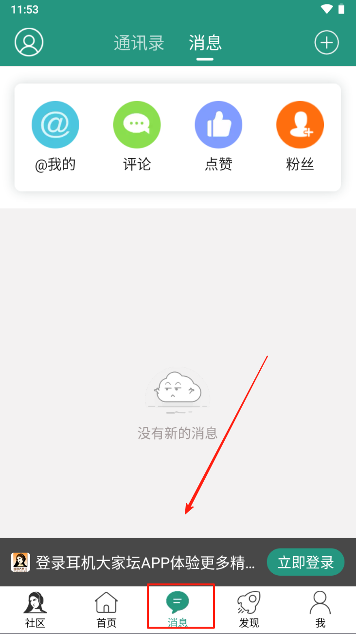 3、点击“消息”进入消息页面,查看@我的、评论、点赞和粉丝信息。