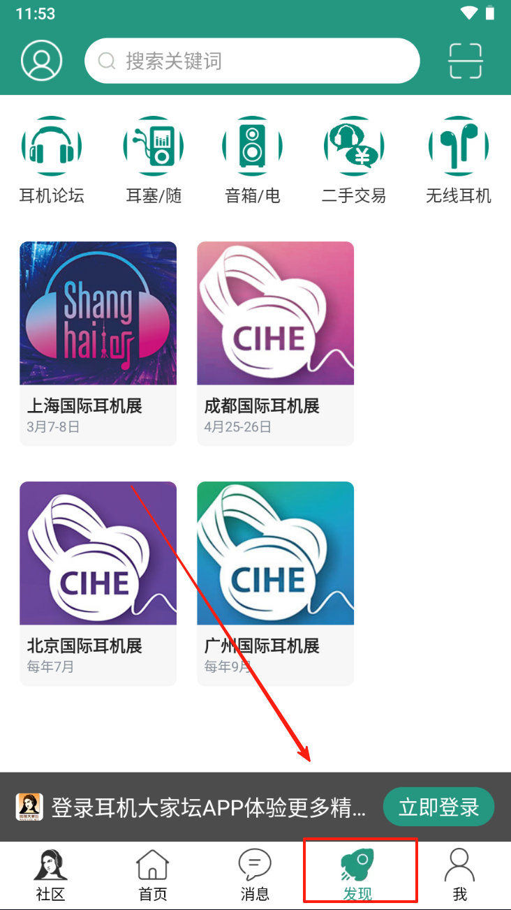4、点击“发现”进入发现页面,搜索关键词或查看耳机展会信息。