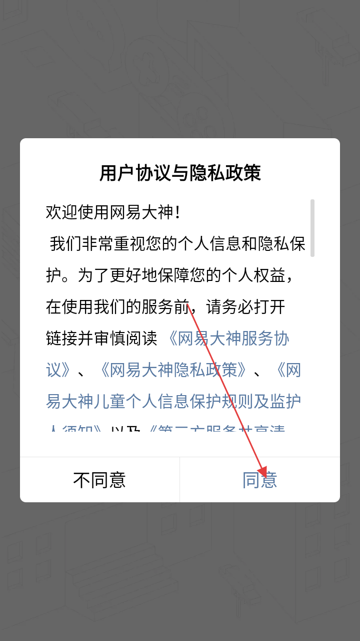1、打开网易大神APP,首先会看到“用户协议与隐私政策”页面,仔细阅读后,点击【同意】按钮。