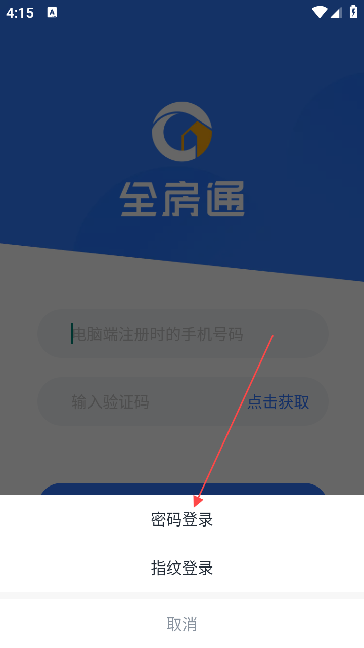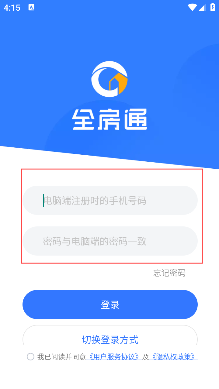 4、密码登录全房通,准确填入【电脑端注册时的手机号码】与对应密码即可登录。
