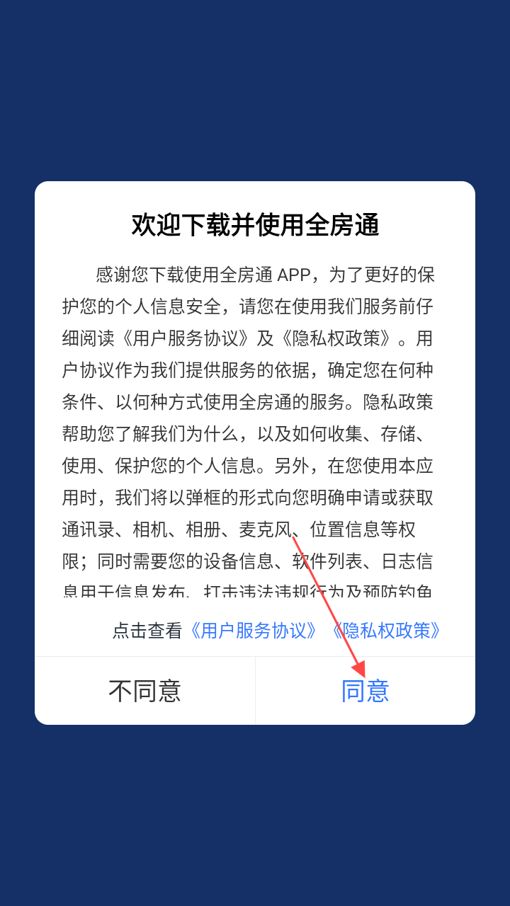1、打开全房通,阅读【用户服务协议】及【隐私权政策】,同意点击【同意】进入。