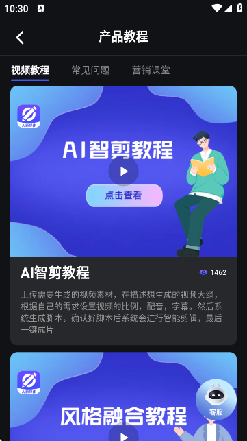 5、进入“产品教程”界面,可查看AI智剪、风格融合等视频教程,学习常见问题解答与营销课堂知识,提升创作技能。