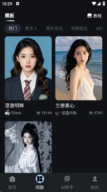4、在“同款”界面,可选择热门、数字人、图片说话等模板分类,挑选心仪模板进行创作