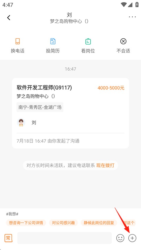 5.和招聘者打招呼,了解职位及个人情况,合适就点右下角“+”;