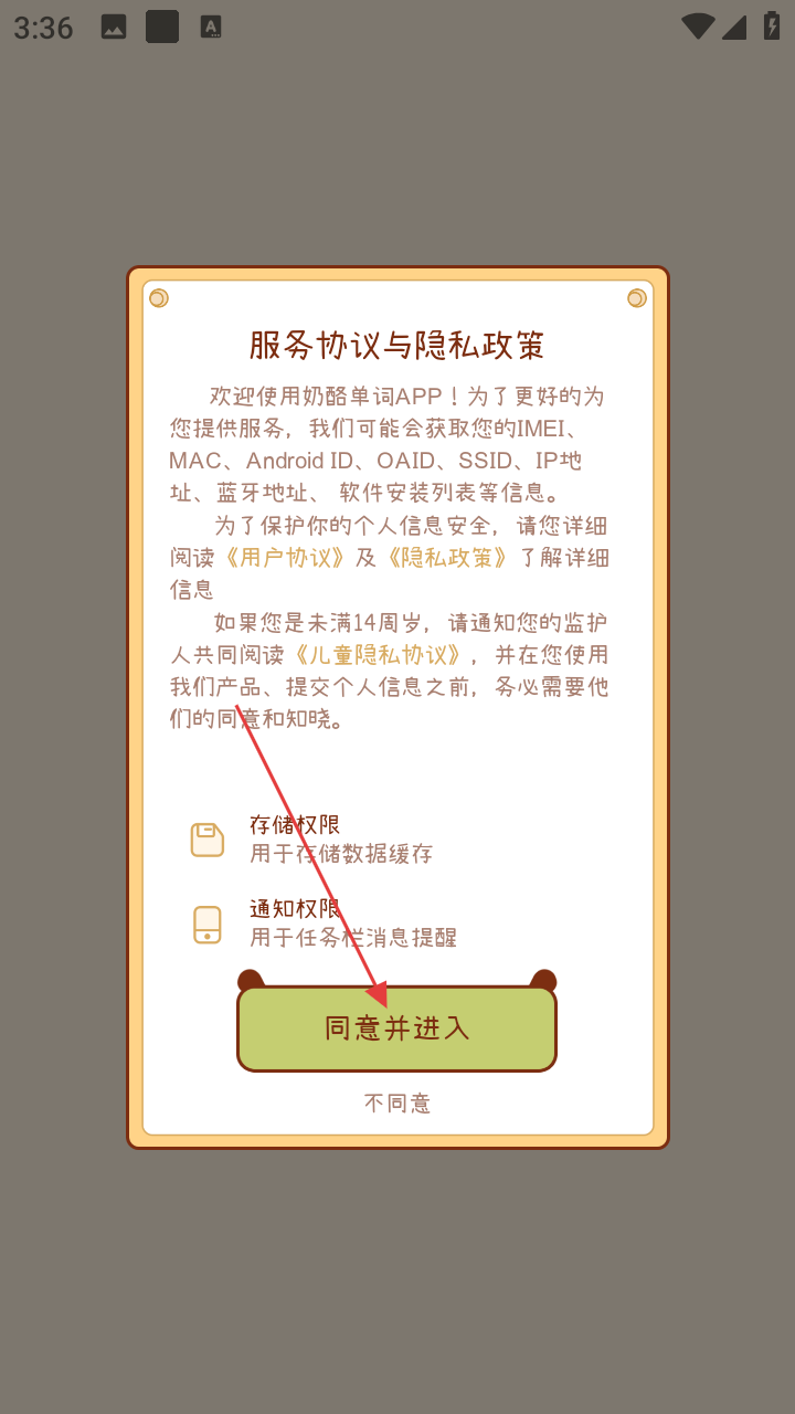 1、打开奶酪单词APP,首先会看到【服务协议】与【隐私政策】提示,阅读后点击【同意】进入下一步。