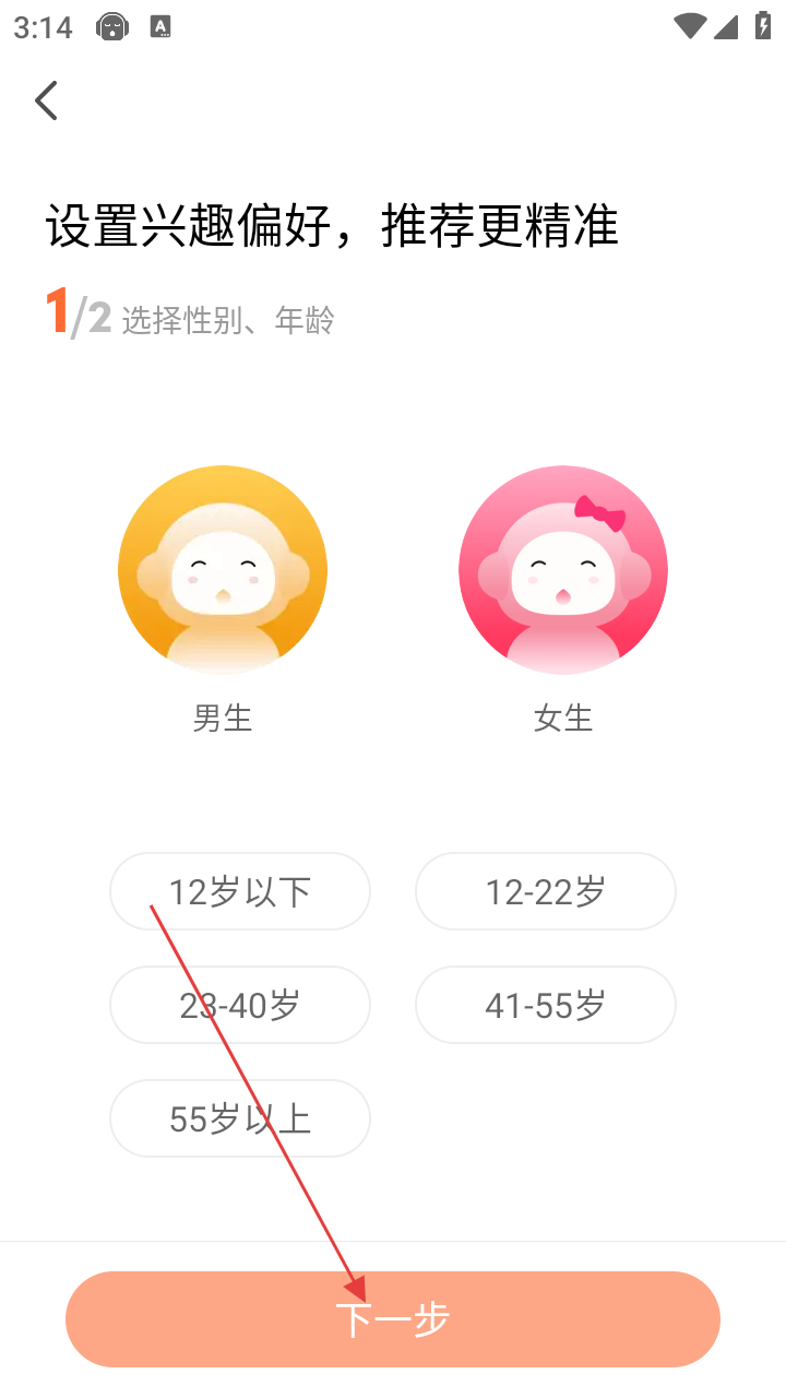 4、在兴趣设置页面,选择性别和年龄区间后,点击【下一步】按钮,继续完成兴趣偏好设置,设置完成后APP将根据偏好更精准地推荐内容。