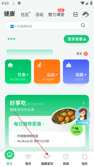 1、打开应用进入首页点击健康星球。