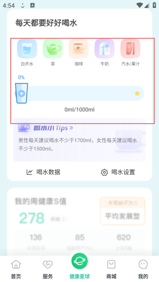 2、进入健康星球在此处可以记录自己的喝水量。