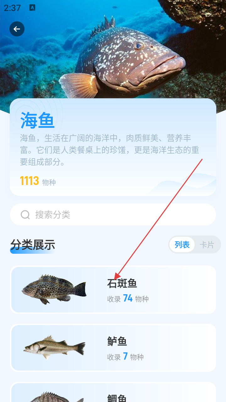 2、在海鱼详情页,找到【石斑鱼】分类,点击进入。