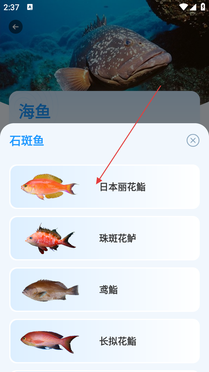3、在石斑鱼分类中,选择【日本丽花鮨】,查看物种详情。