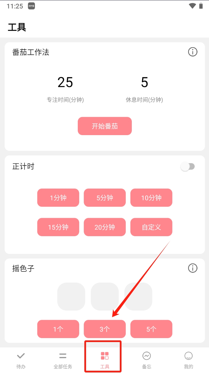 2、点击“工具”图标,进入工具页面,选择并使用番茄工作法等工具。