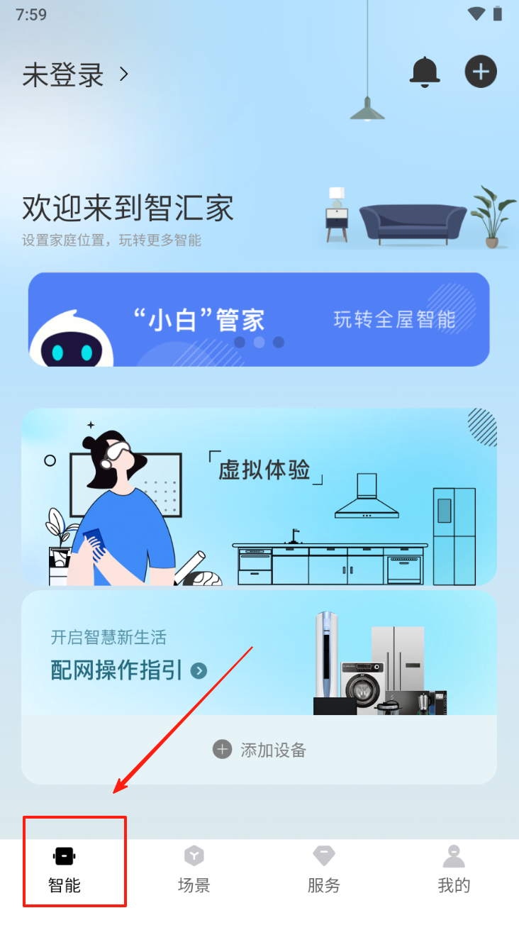 2、选择智能选项:在首页点击“智能”选项,进入智能家居管理页面。