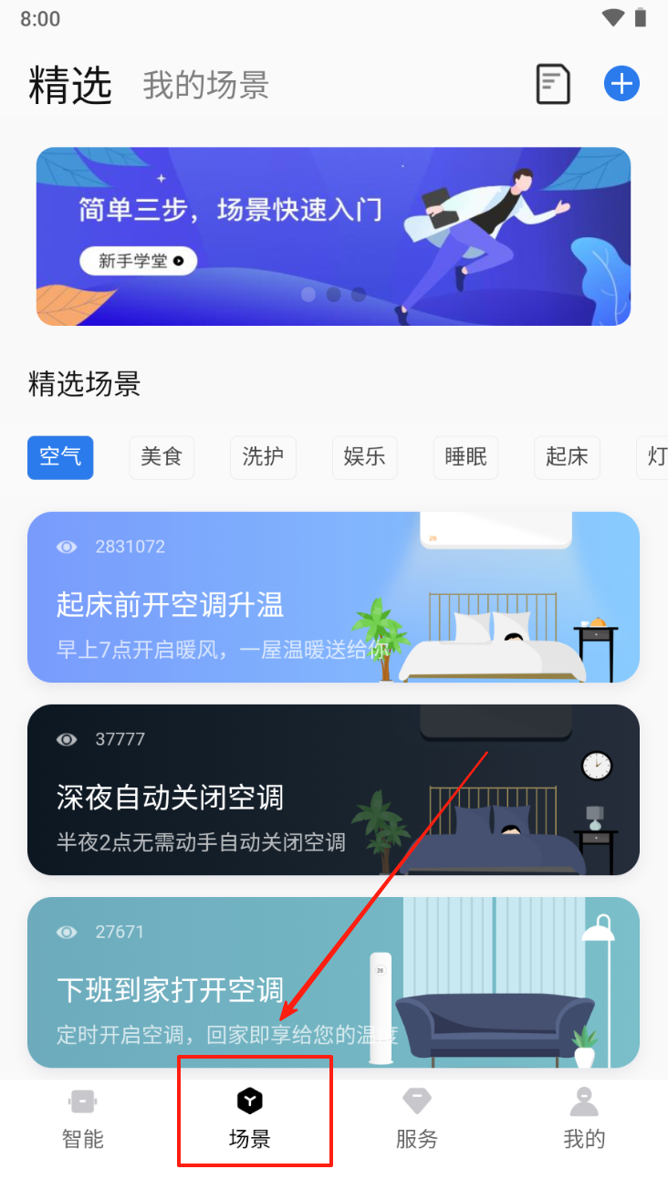 3、进入场景页面:点击底部导航栏的“场景”选项,查看和管理智能场景。