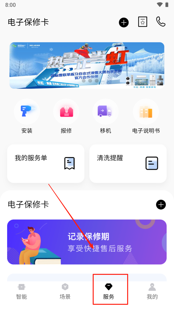4、选择服务选项:点击底部导航栏的“服务”选项,查看可用服务和电子保修卡。