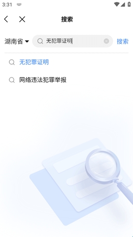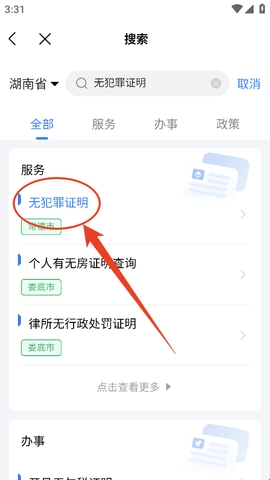 2、然后在搜索框输入“无犯罪证明”,搜索出来后点击进入。