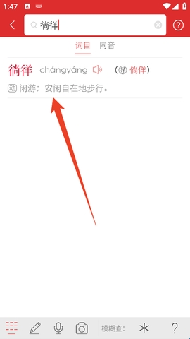 1、如果需要查某个字或词,直接在首页词典搜索框这里搜索查找,例如我要查“徜徉”这个词的发音。