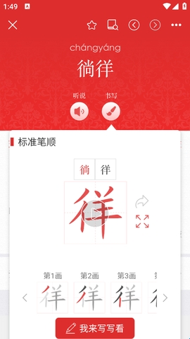 3、然后就能看到这个词的解析、拼音、书写等信息,点击“听书”,就能知道它的发音了。