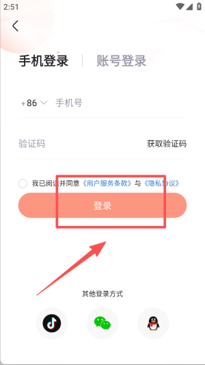 4、在登录界面,可选择手机登录,输入手机号和验证码后点击 “登录”,也可选择其他登录方式。