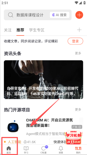 1、点击底部 “首页”,可浏览资讯头条、热门开源项目等内容,还能使用搜索功能查找数据库课程设计相关信息。