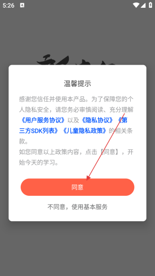 1、打开应用查看温馨提示点击同意。