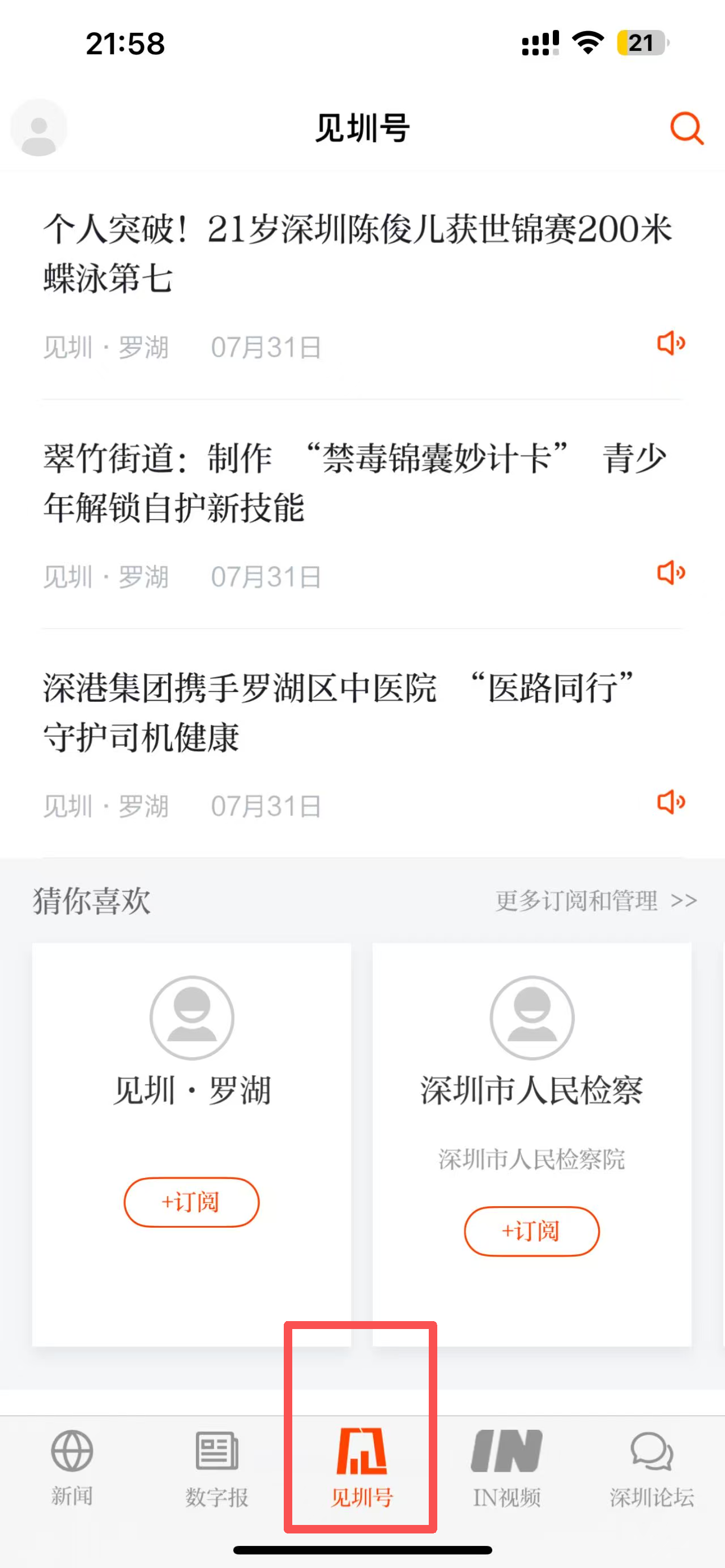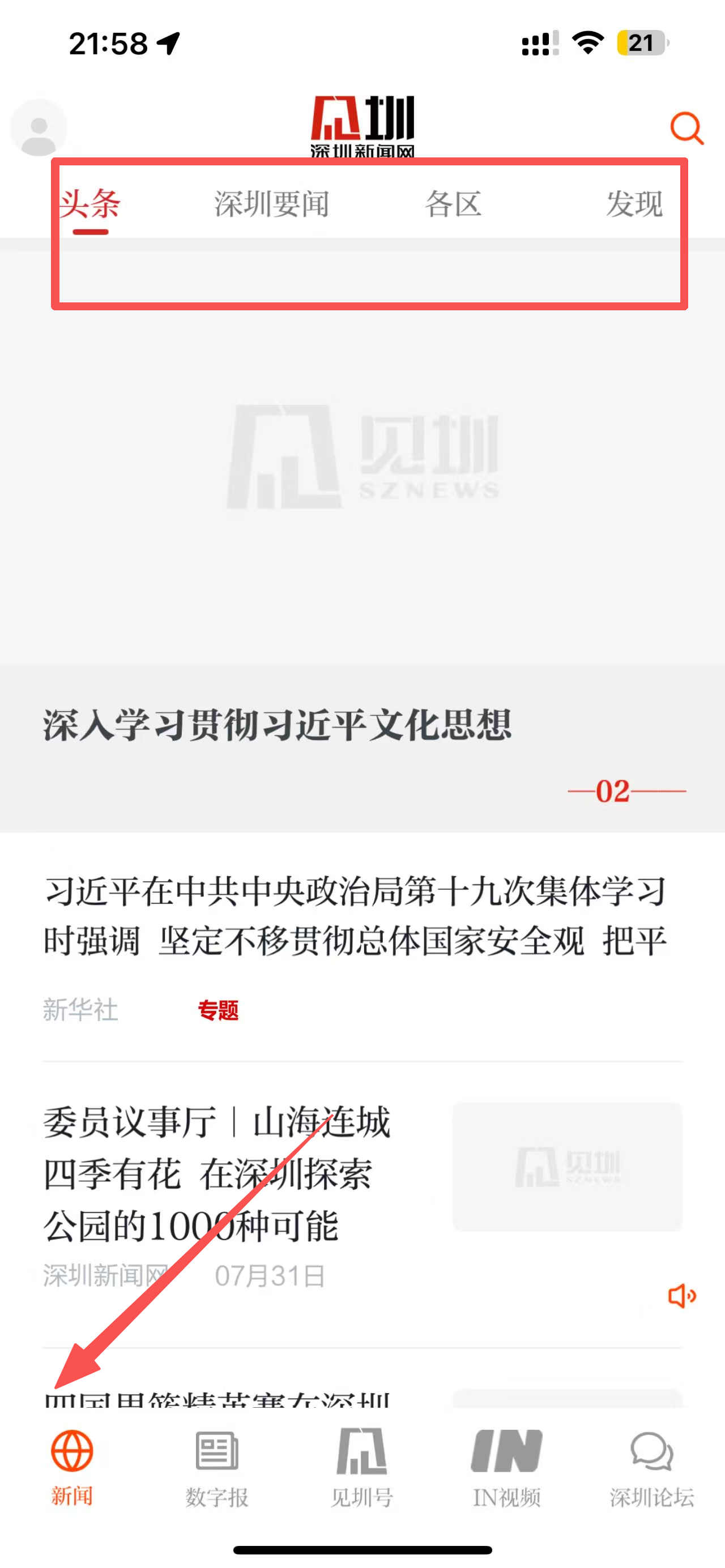 3、点击底部导航栏的“见圳号”选项,查看见圳号的新闻资讯。