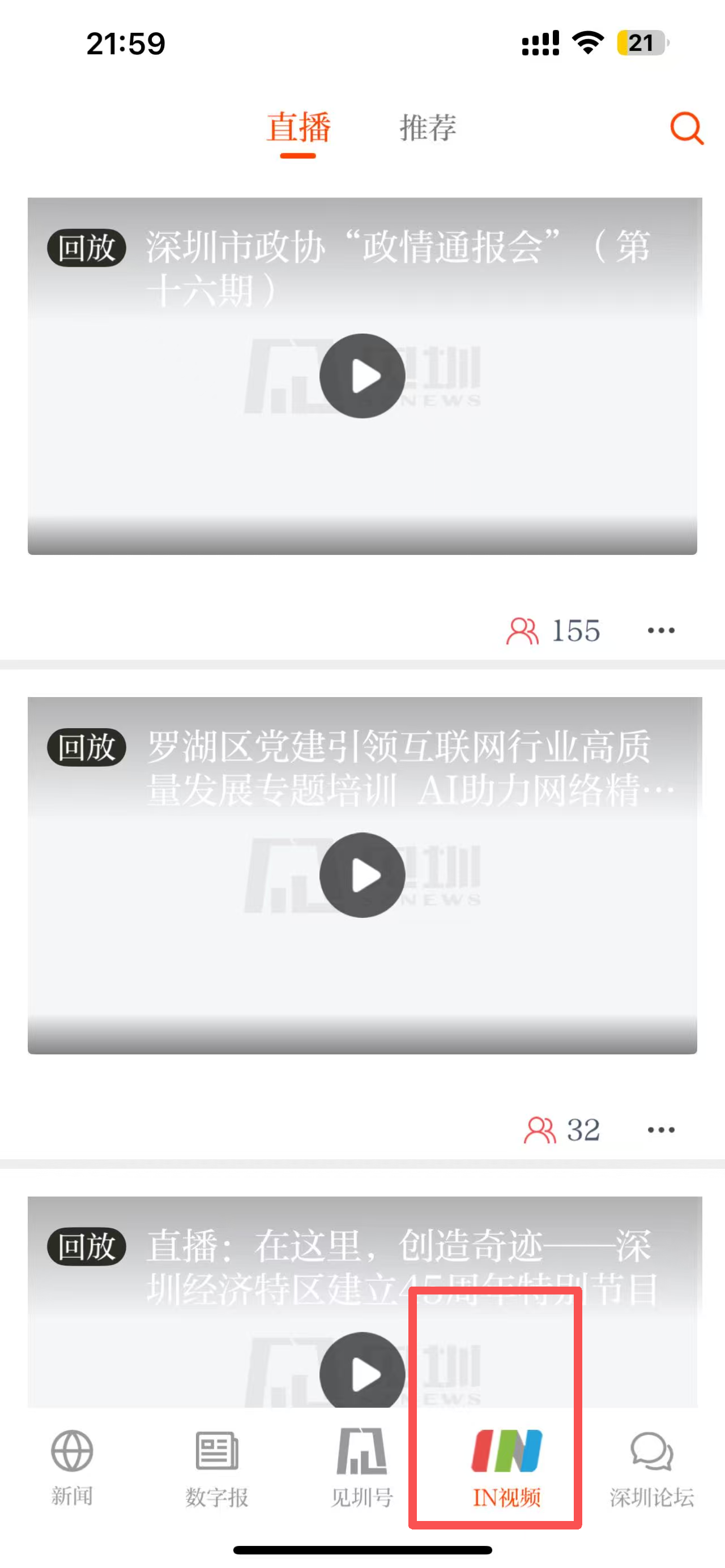 4、点击底部导航栏的“IN视频”选项,观看最新的视频直播内容。