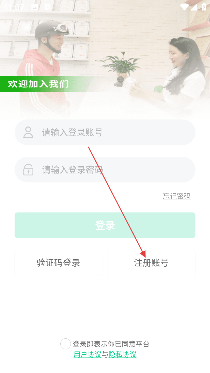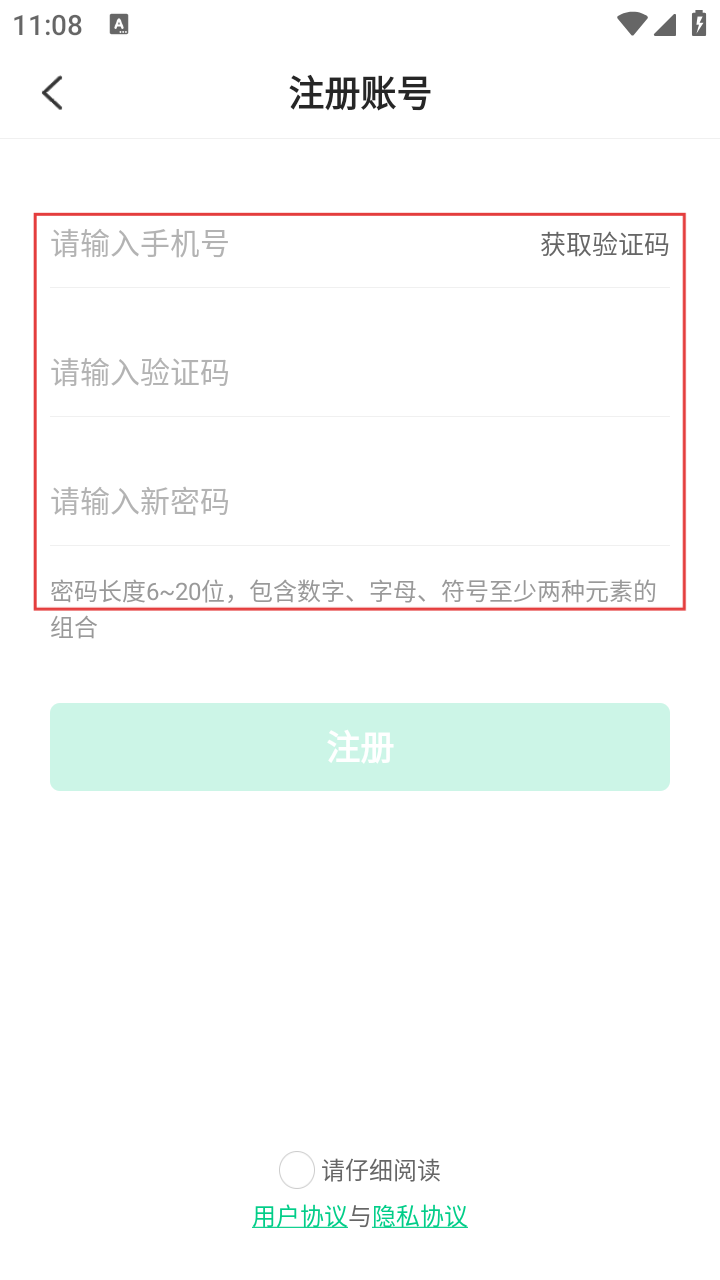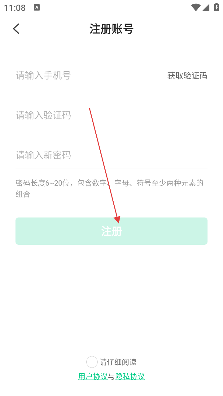 3、在注册页填【手机号】【验证码】【新密码】,勾选协议。