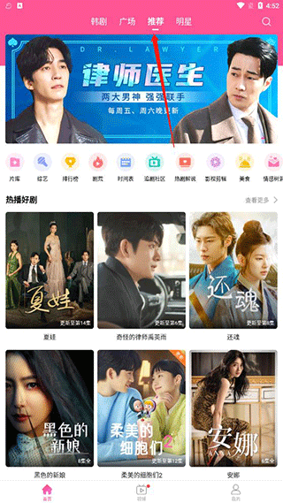 1、打开韩站首页,你会看到四大主要模块:韩剧、广场、推荐和明星。点击“韩剧”即可浏览当下热播剧集、精选好剧以及多种分类;