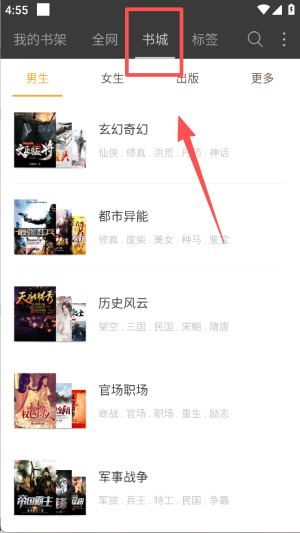 3、点击 “书城”,可查看男生、女生、出版等分类的小说,如玄幻奇幻、都市异能等类型。