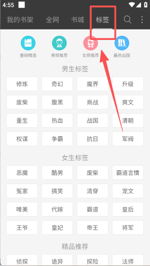 4、点击 “标签”,可通过重磅精选、男频推荐等入口,还有男生、女生标签查找感兴趣的小说。