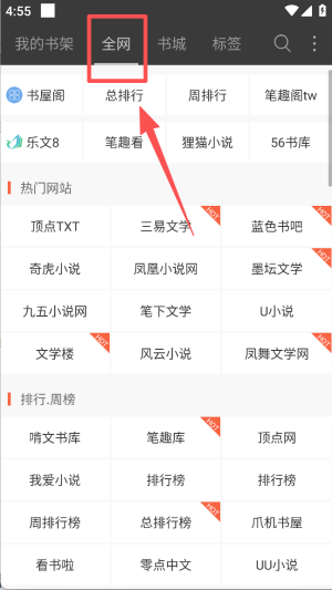 2、点击 “全网”,可浏览总排行、热门网站等板块,查找各类小说资源。