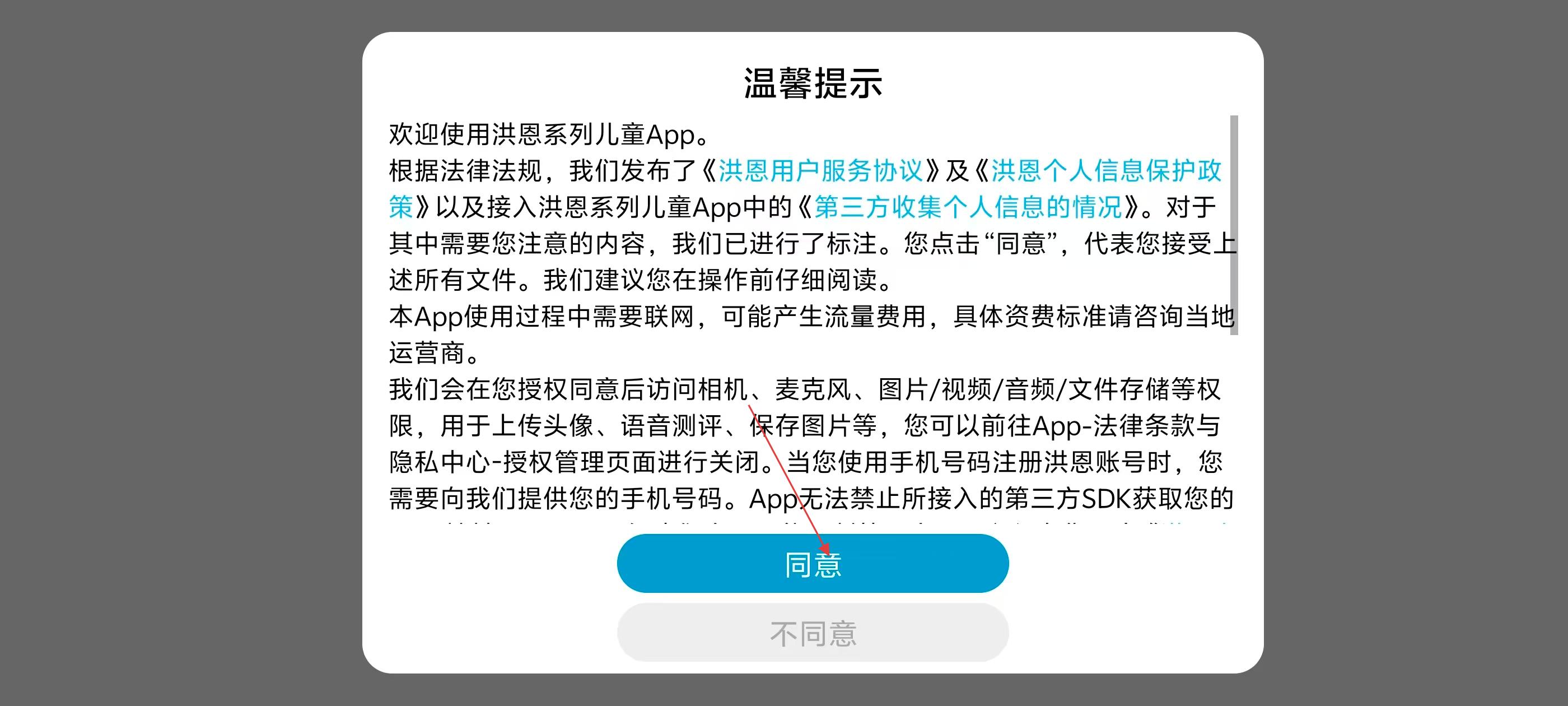 1、使用洪恩系列儿童App前,需阅读《洪恩用户服务协议》《洪恩个人信息保护政策》等,点击【同意】方可使用。