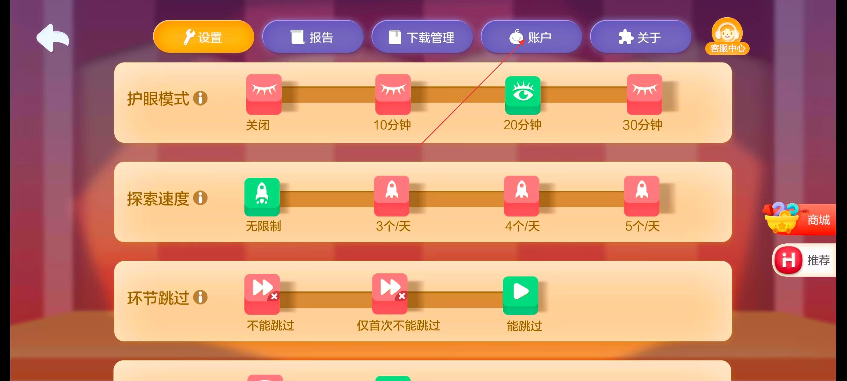 3、在洪恩数学APP设置界面,点击【账户】可查看孩子的档案信息,包括性别、生日等,还能设置护眼模式、探索速度等。