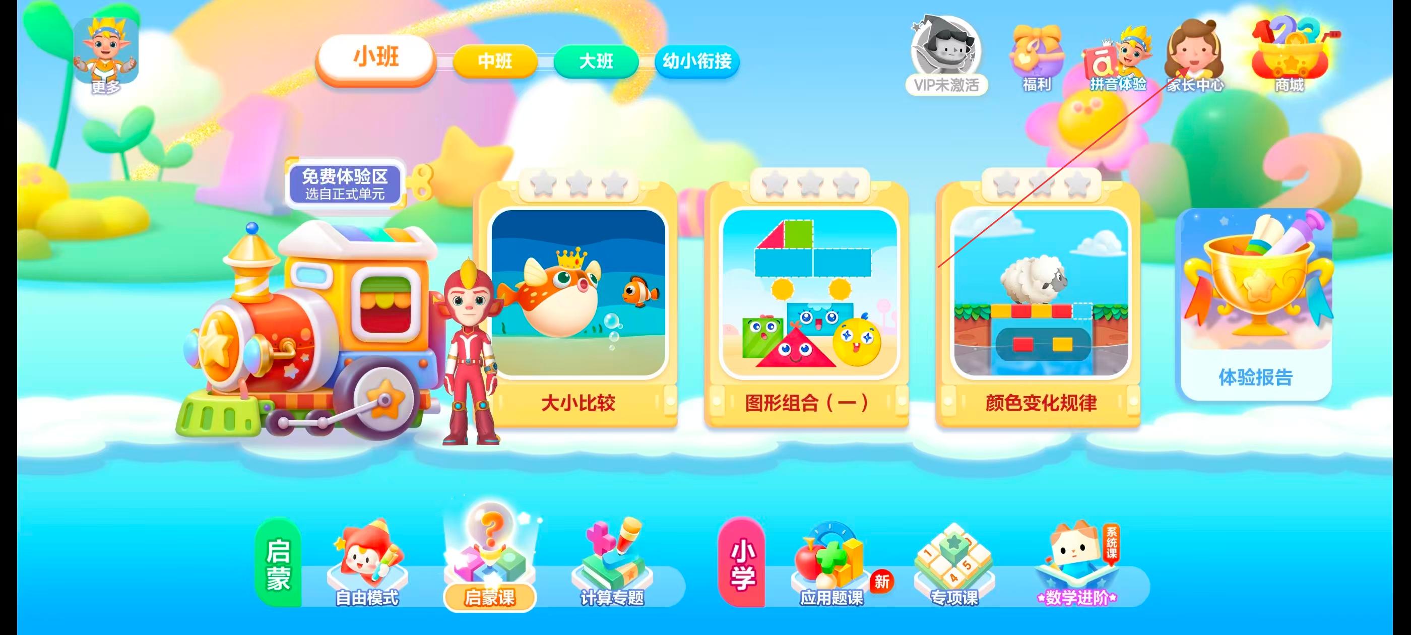 2、进入洪恩数学APP学习界面,有小班、中班等年级分类,还有大小比较、图形组合等学习内容,点击【家长中心】可进入家长管理界面。