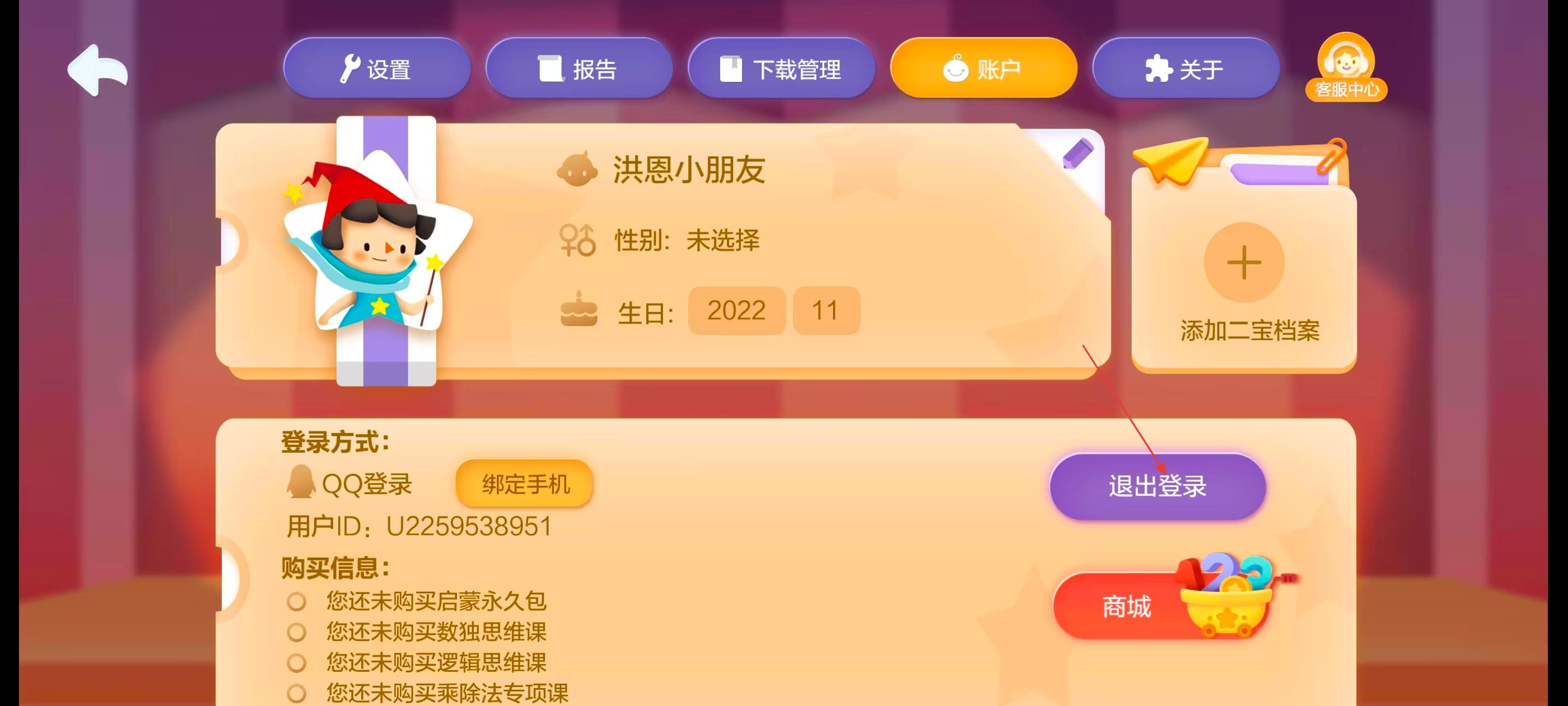 4、在账户界面,可查看登录方式、用户ID等信息,也可点击【退出登录】切换账号,还能添加二宝档案,方便多孩家庭使用。