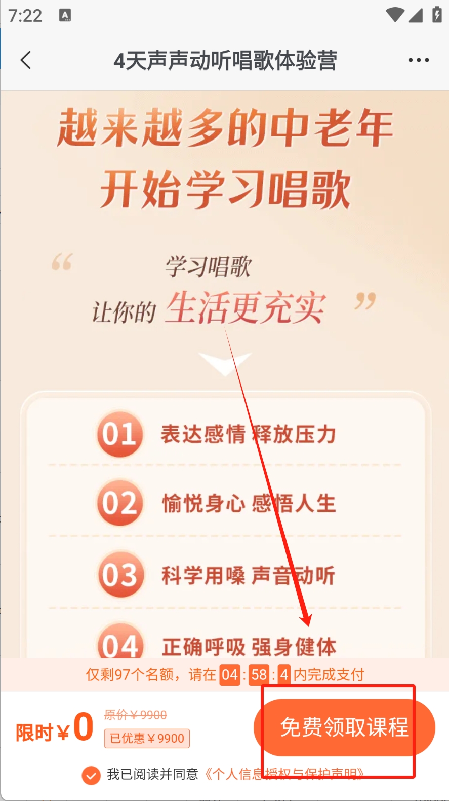 3、领取课程:点击“免费领取课程”按钮获取课程。