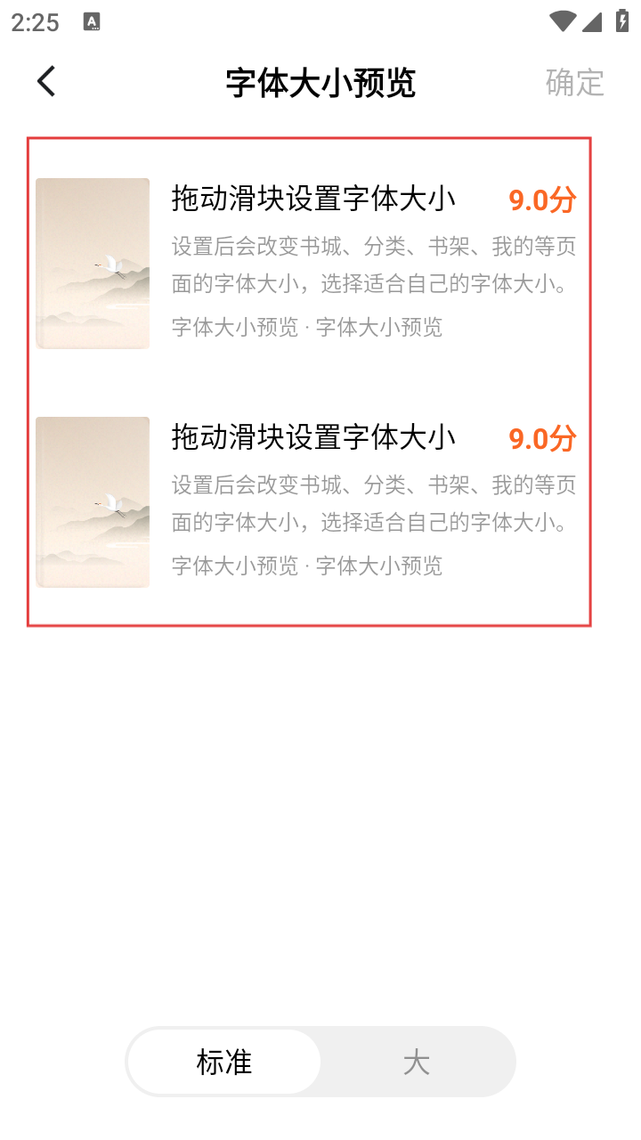 4、在字体大小预览页面,拖动滑块设置字体大小,设置后会改变书城、分类等页面的字体大小,选择适合自己的字体大小后点击【确定】。