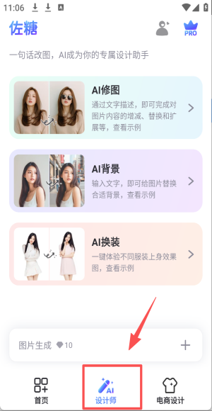 2、点击“设计师”图标,进入设计工具页面,选择“AI修图”等选项。