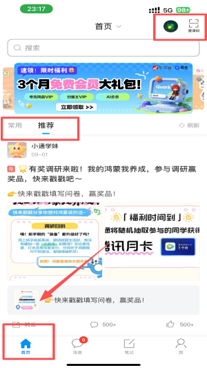 1、打开首页,点击右上角的“消息”按钮,进入消息页面。