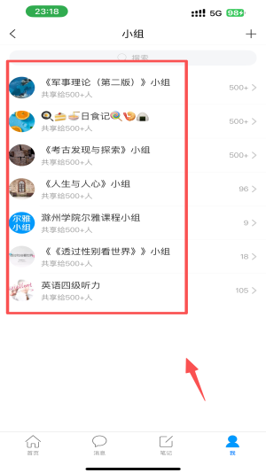 3、在个人中心页面,点击“小组”选项,查看可用小组列表。